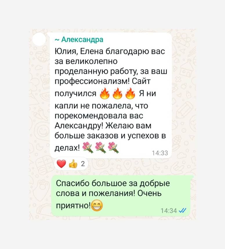 Юлия, Елена, благодарю вас за великолепно проделанную работу, за ваш профессионализм. Сайт получился 🔥🔥🔥 Я ни капли не пожалела, что порекомендовала вас Александру! Желаю вам больше заказов и успехов в делах! 💐💐💐