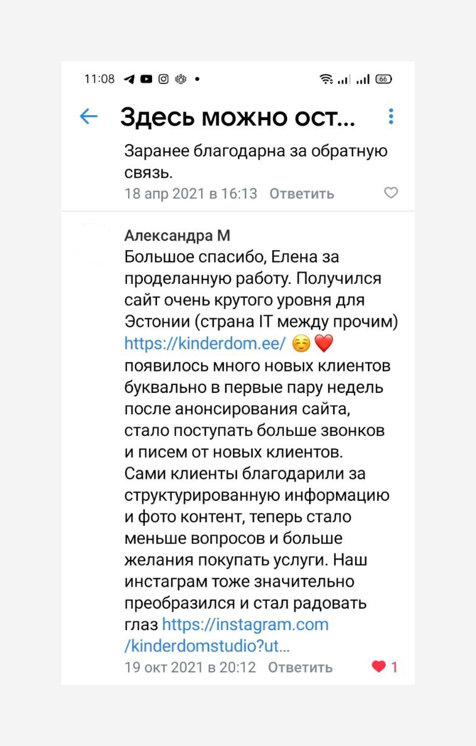 Большое спасибо, Елена за проделанную работу. Получился сайт очень крутого уровня для Эстонии (страна IT между прочим) https://kinderdom.ee/❤️️😳появилось много новых клиентов буквально в первые пару недель после анонсирования сайта, стало поступать больше звонков и писем от новых клиентов. Сами клиенты благодарили за структурированную информацию и фото контент, теперь стало меньше вопросов и больше желания покупать услуги …